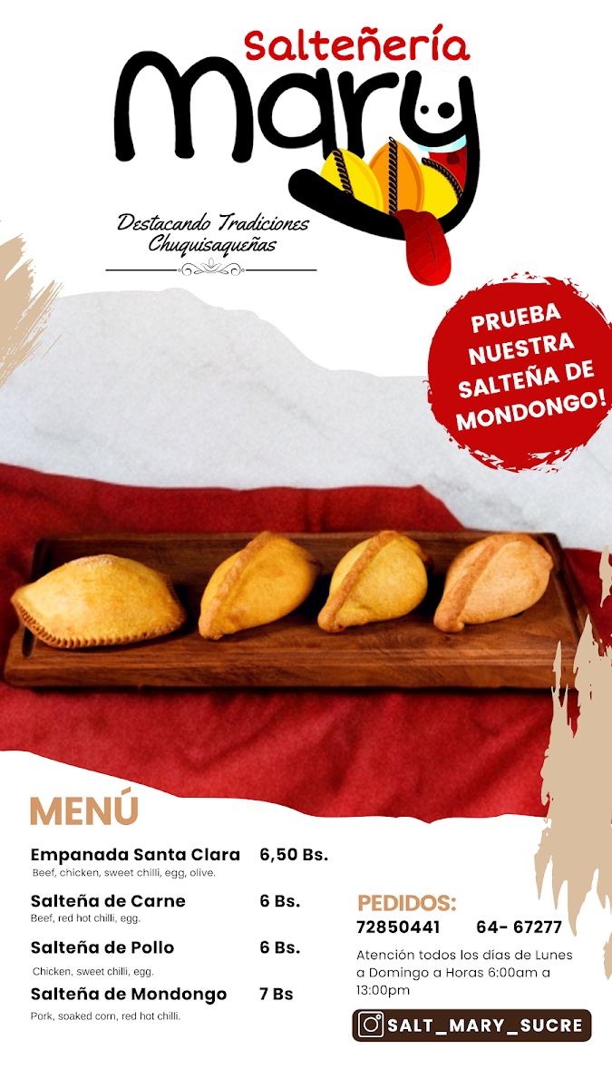 Welcome to Salteneria Mary, a delightful café situated in the heart of Sucre, Bolivia, where culinary creativity meets traditional flavors. This cozy spot is renowned for its exceptional salteñas, offering a variety of choices including chicken, beef, and the unique mondongo pork, with a burst of rich, savory soup inside each bite. Customers rave about the quality of the dishes, praising the salteñas for their special flavors and pleasant atmosphere.